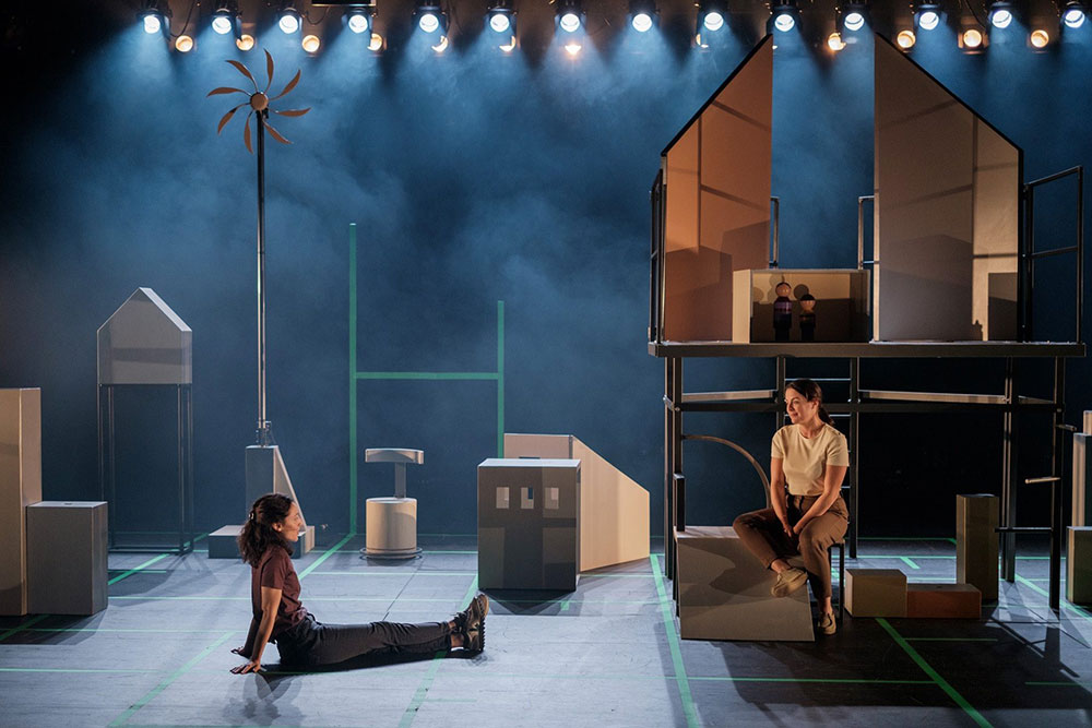Dès les premières secondes, l’éclairage conçu par Julie Basse éblouit à un point tel qu’elle obstrue la vue des spectateurs pendant un moment. Ce simple choix de conception suggère déjà que la pièce ne se veut pas un divertissement léger. Alors que cela se reproduira à quelques reprises au cours de la représentation, cette première fois est suffisamment inconfortable et surprenante pour donner à ressentir le choc d’apprendre une nouvelle qui, sur le coup, est terrifiante. Accompagnés par la musique et l’environnement sonore de l’œuvre de Frédéric Auger qui insufflent un certain sentiment d’urgence, ces effets de lumières n’en sont que plus saisissants. Cela offre un intéressant contraste avec le décor imaginé par Patrice Charbonneau-Brunelle qui a été confectionné, en grande partie, dans des teintes assez neutres. Il importe de souligner l’originalité avec laquelle le concepteur a su incorporer un aspect ludique à un espace scénique où la symétrie domine visiblement, tandis que divers solides géométriques remplissent la scène et deviennent les «jouets» à la disposition des interprètes pour figurer un changement de lieu dans le récit. Ces éléments de décor s’agencent parfaitement avec le ruban adhésif vert collé au sol, tel un quadrillage avec quelques imperfections évidentes. Attirant l’œil, cet ajout offre de quoi rappeler la structure de la société dans laquelle des chemins clairs et droits sont tracés comme repères, mais dont la présence de lacunes dans leur constitution est facile à repérer. Il convient aussi de dire que ces lignes permettent aux comédiennes de s’amuser à les suivre ou à les éviter tels des enfants se servant du sol pour s’inventer leur propre jeu.